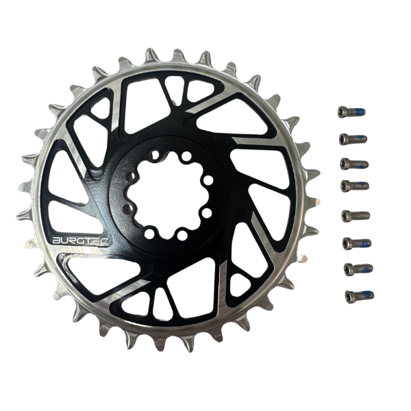 Burgtec's new chainring for SRAM T-Type Eagle Transmission is developed for cyclists who demand maximum durability, precise power transfer and uncompromising performance. The chainring is CNC-machined from high-quality aluminum and designed to work perfectly with SRAM's T-Type chain and Transmission system.