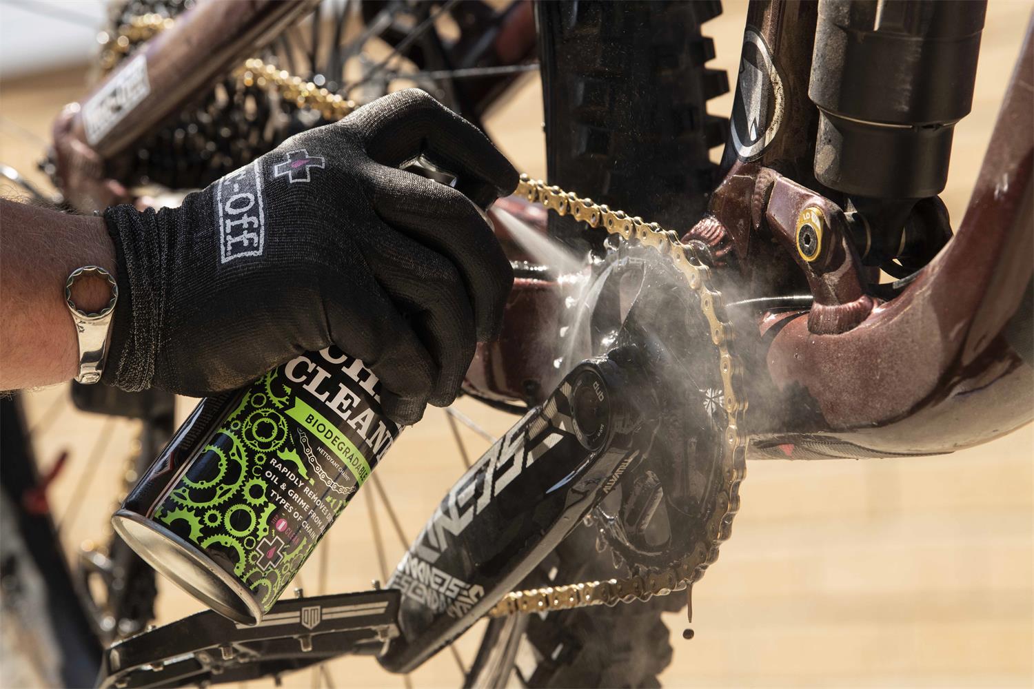 Muc-Off high-performance Bio Chain Cleaner has been specifically formulated to quickly and safely remove heavy chain grime using advanced solvents. Its unique formula breaks down oil and grease to leave the entire chain sparkling clean and contaminant free.
