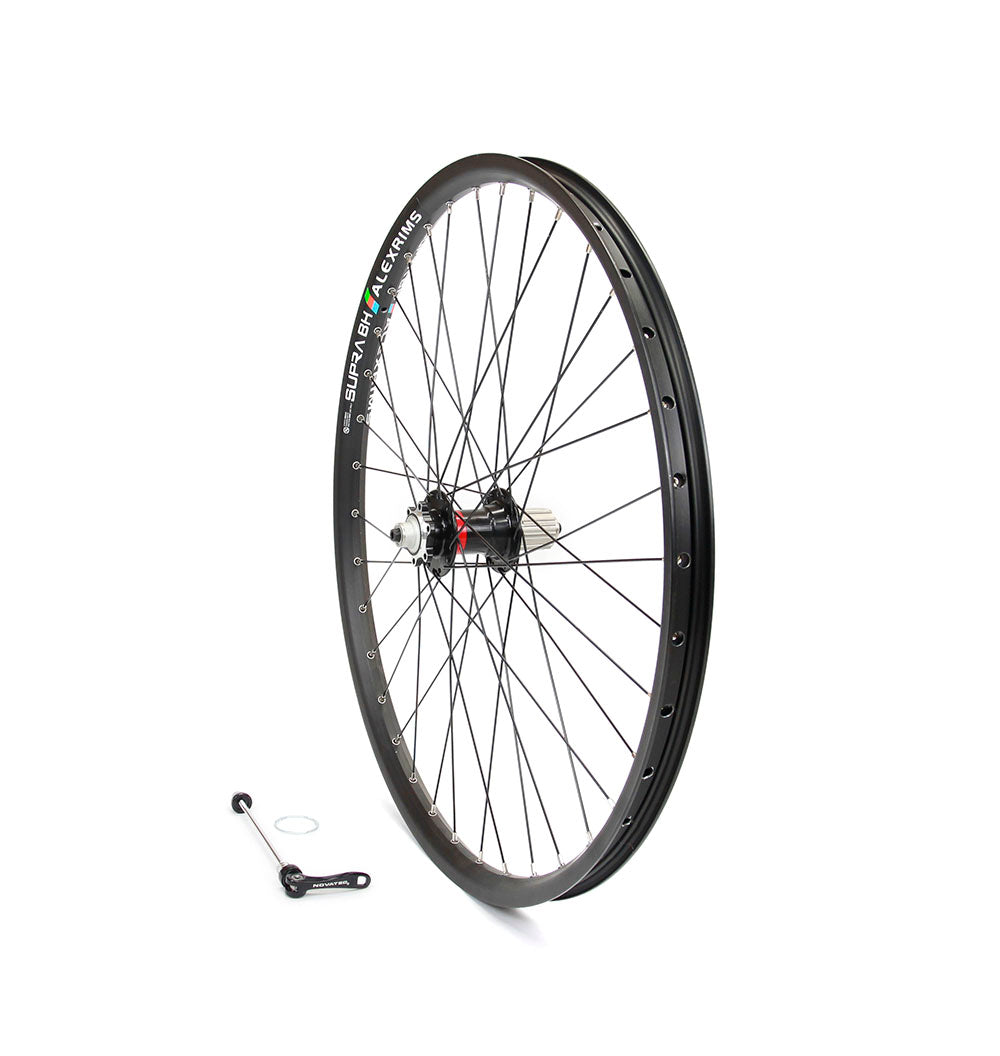 Robust wheels for freeride/downhill riding. Front and rear freeride wheels with Novatec 2 and 4 sealed bearing, 6 bolt, standard axle diameter hubs laced to 36-hole Alex Supra BH rims with Mach 1 black spokes.