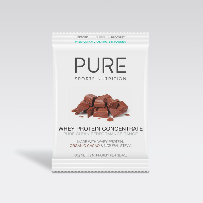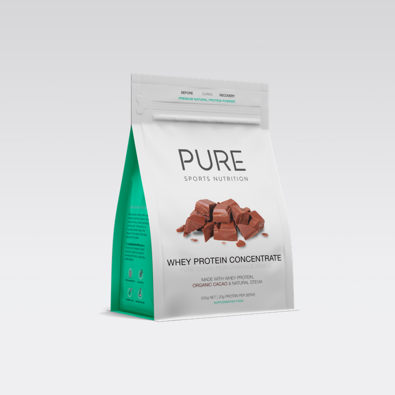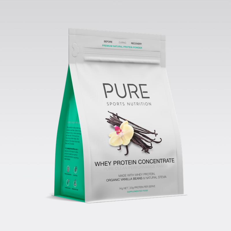 PURE Whey Protein is a premium natural protein powder using New Zealand made whey protein concentrate (82% protein) made with the milk from grass-fed cows. Whey protein contains one of the richest sources of branch chain amino acids. The whey is combined with other premium ingredients to make three flavour options: Chocolate, Salted Caramel and Vanilla. The range is designed to be natural and easy to consume after exercise and formulated to provide the body with protein for optimum muscle tissue building and repair. It is made to assist with supporting energy levels and weight control as part of a balanced lifestyle.